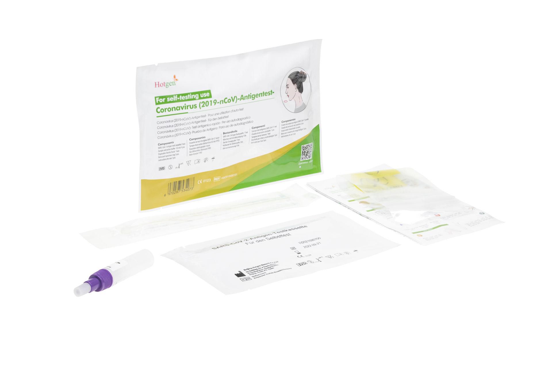 Mit dem Hotgen Test erhalten Sie einen hochwertigen Antigen Selbsttest, der dem qualitativen Nachweis von Nucleocapsid Antigenen im vorderen Nasenraum dient. Er basiert auf der Lateral-Flow-Immunoassay-Methode, bei der mithilfe von Antikörpern bestimmte Antigene im Probenabstrich nachgewiesen werden.